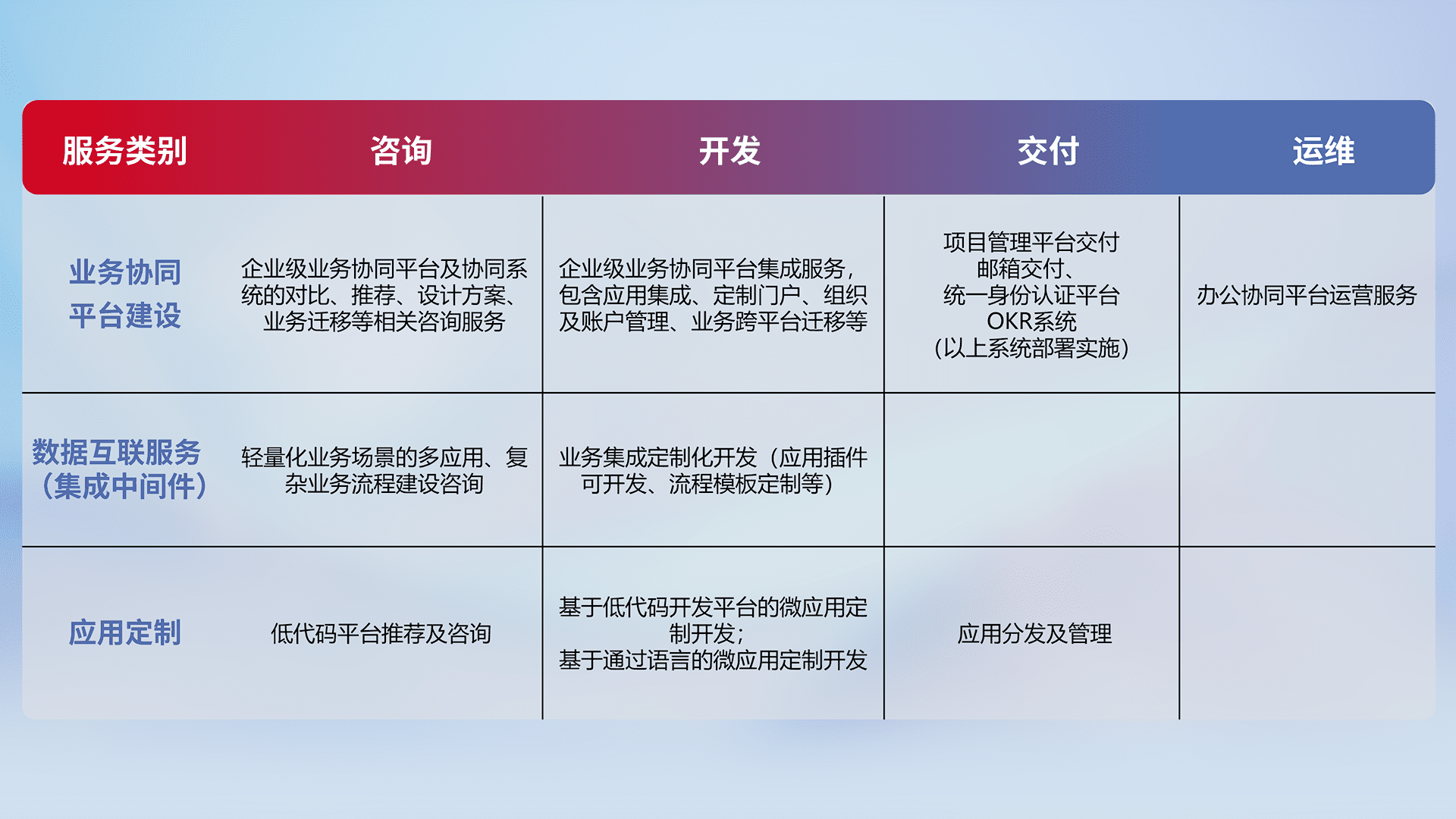 针对钉钉、、企微、、、IDaas等平台级产品提供产品的规划、、、方案、、、交付、、定制化开发等服务,,,实现如统一协同办公、、、、智能客户服务、、、混合会议管理、、智能数据查询、、、等业务场景,,实现数字化转型。。