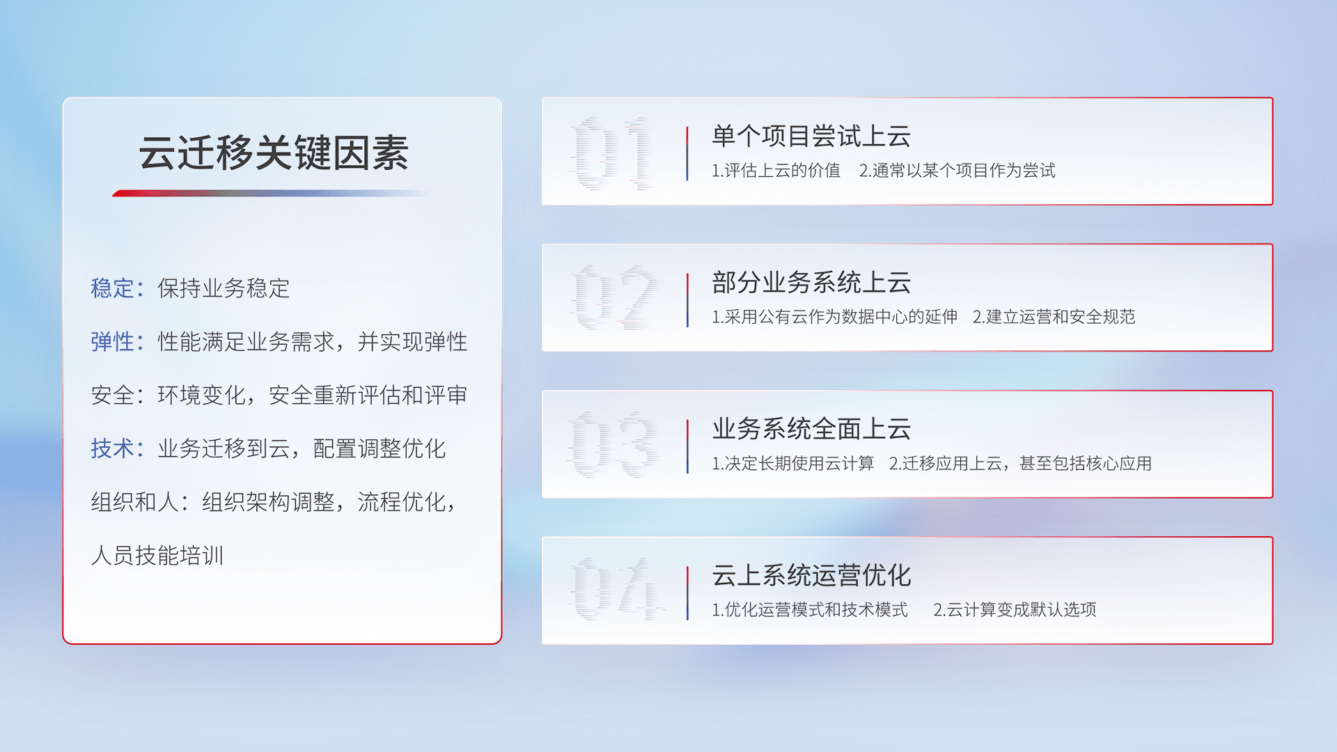 结合实际业务,,,,从规划设计、、云平台选型、、云原生改造、、数据迁移、、、集成交付,,迁移全过程为客户识别最佳上云路径,,做好风险识别管理,,,设计网络架构、、、、身份权限、、安全审计合规、、操作审计、、、、日志审计、、、、监控告警策略、、、多站点容灾设计等,,,对云上基础设施进行整体规划,,,,提升IT治理水平,,以满足弹性、、、高可用、、、、高性能的需求。。。