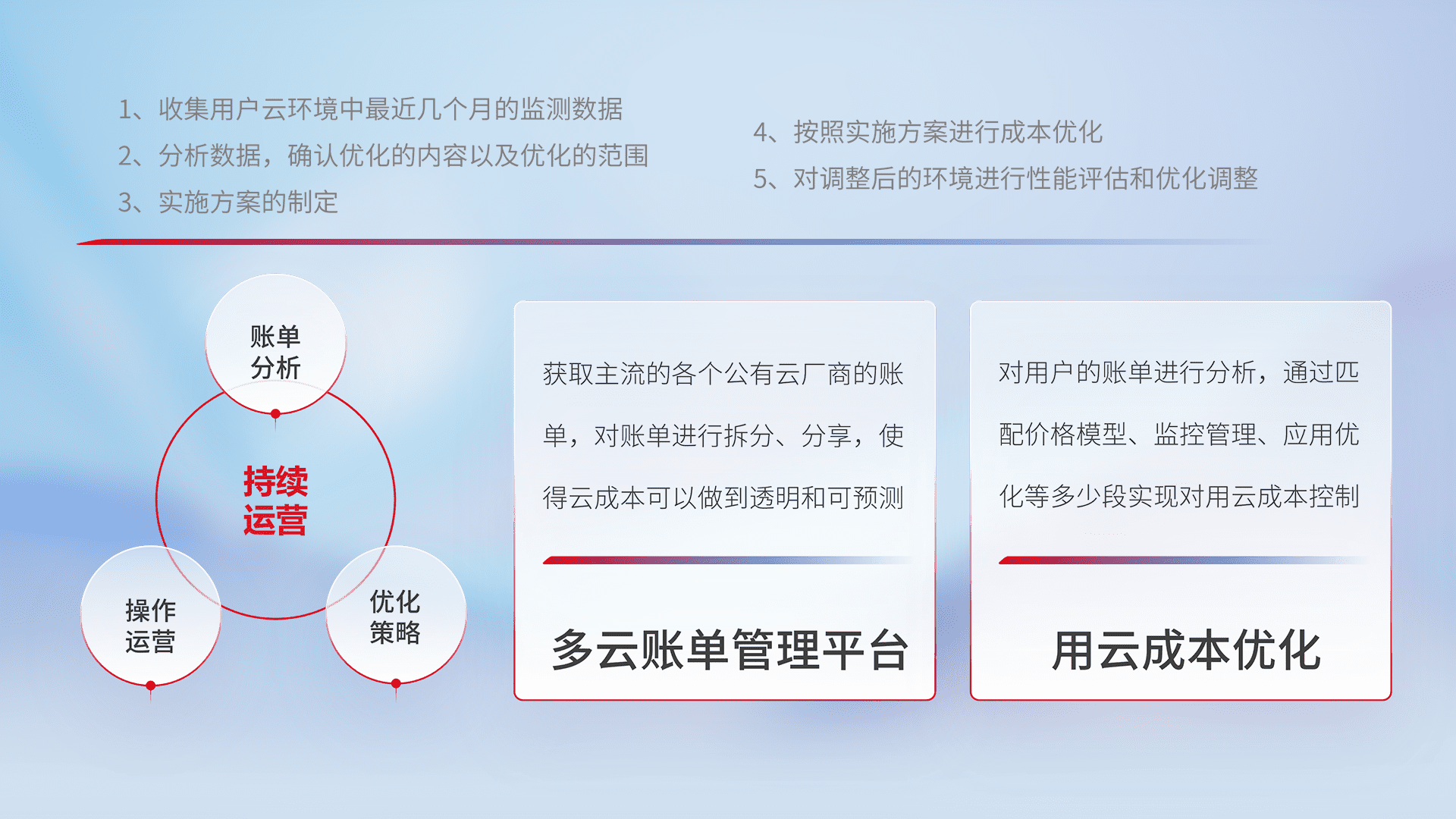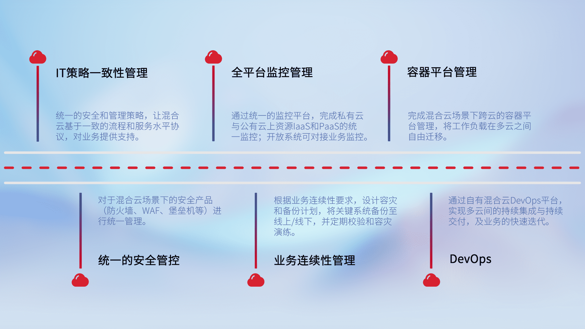 通过多云纳管,,,,以统一的资源数据模型把客户的云资源进行抽象和封装,,,,进而实现对多云资源的统一操作,,,保障云资源管理的可靠性、、稳定性与可用性。。量身定制化运维内容,,配置、、开发运维、、、补丁管理、、备份、、监控、、、认证和访问管理、、、、审计和日常巡检等,,,,保障在用云过程中的可靠度,,,稳定度以及高可用率。。
